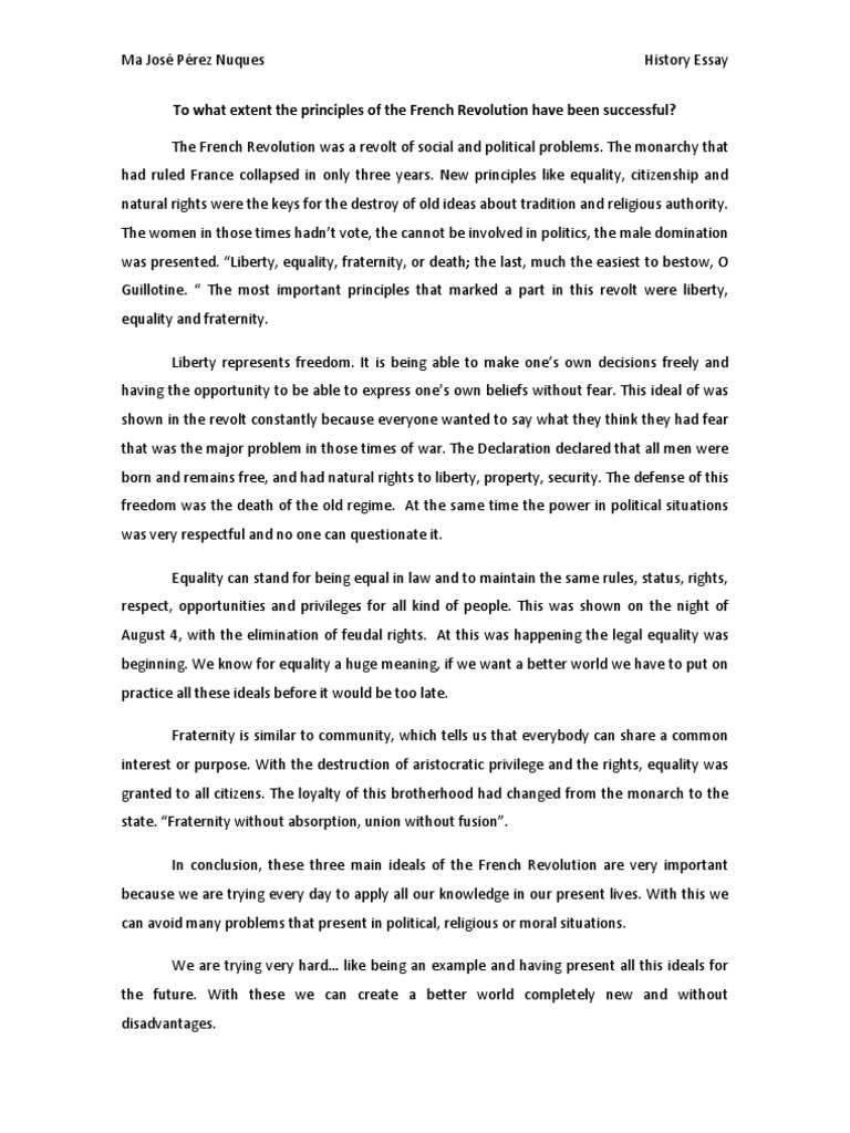 · 10 Lines on French Revolution Essay in English 1. French revolution happened in France in 2. It was a horrifying event in the history of France. 3. The bankruptcy due to government debt, the class conflicts, the absolute rule and the Enlightenment, led to the 4. The third estate of the Essays on French Revolution $ for a 2-page paper get custom paper French Revolution DBQ The French Revolution of caused many changes in the social, political, and economical world of France. The French Revolution sparked the beginning for many new reforms in France that were previously unavailable to the 3rd estate · The fact that the French Revolution had taken such an irrational and anarchic course went against their beliefs in "rational order and scientific method." [31] The philosophes favoured a far more gradual progression of the Revolution through reform and allowing the leaders and the population of France to come to understand the ideas of the Enlightenment
